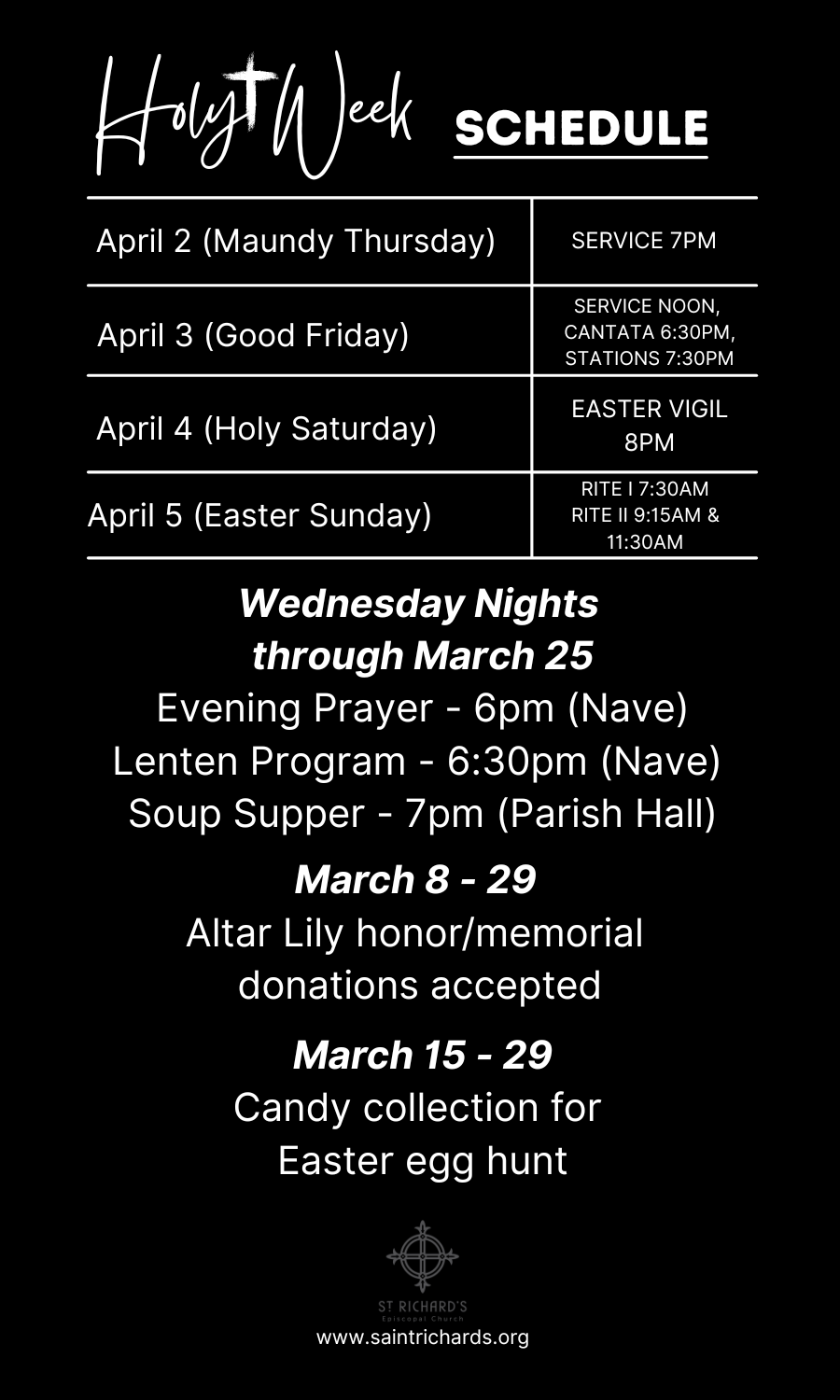 Weekly E-Blast: To receive our weekly e-blast, sign up HERE or text SAINTRICHARD to 22828.